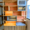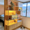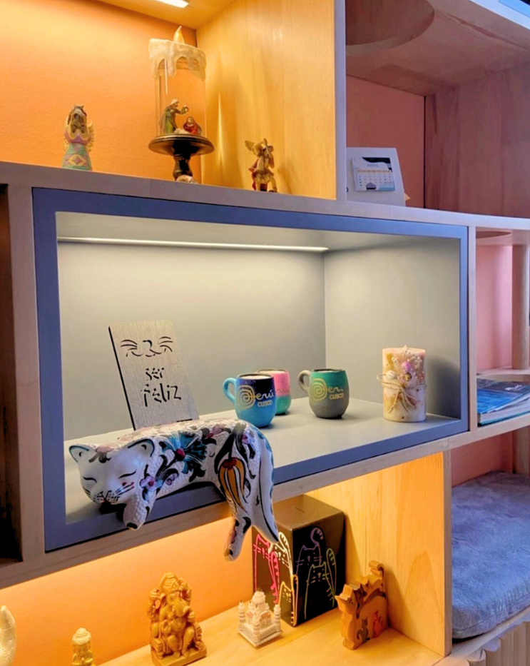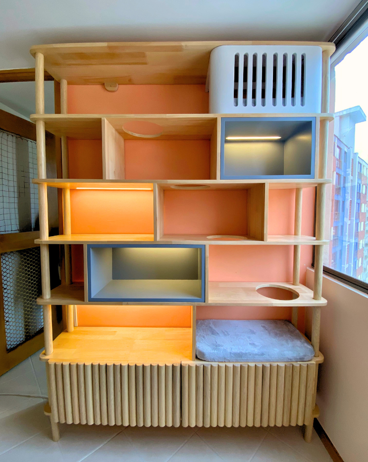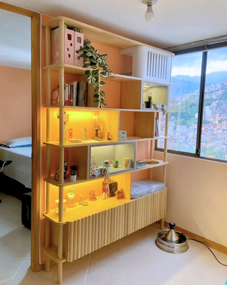 Elegante librero fabricado en madera pino, con sutiles toques en color blanco y gris, que busca combinar estética, calidez y practicidad. Cuenta con espacio para que tu gatito pueda utilizarlo y luz cálida incorporada.