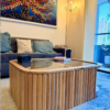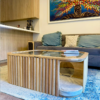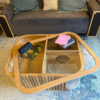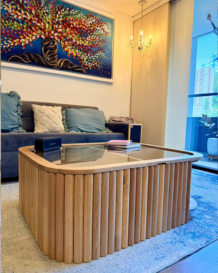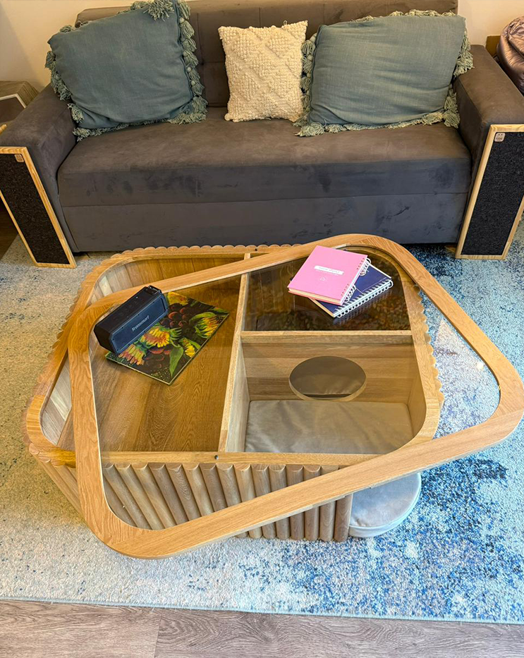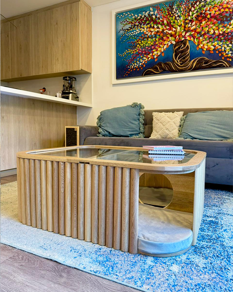 Elegante mesa de centro fabricada en madera pino, con tapa superior en vidrio templado y compartimentos internos multifuncionales para que tú puedas decorar a gusto y para que tu gatito se pueda resguardar.